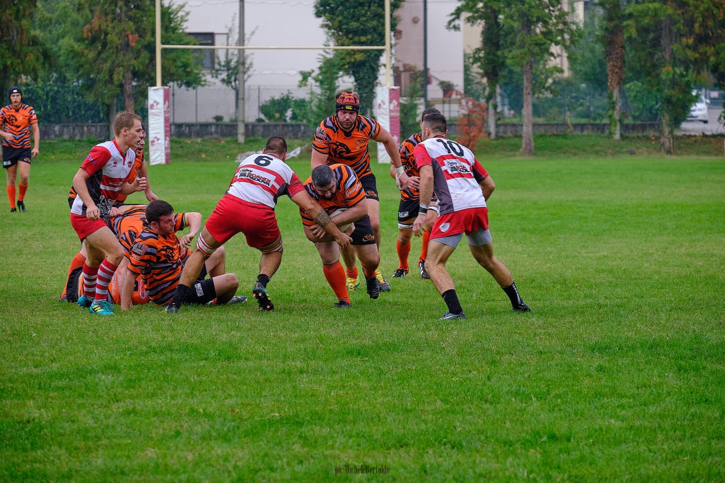 Arbitro federale, anche se non ci è stato come speravamo di grande aiuto, anzi giustamente siamo stati più volte penalizzati per la riprovevole mania di parlare continuamente in campo. La partita inizia con un Monselice molto motivato che riesce a segnare un uno-due con 2 calci piazzati in 3 minuti dovuti ad indisciplina del RAV e si porta agevolmente sul 6-0.
